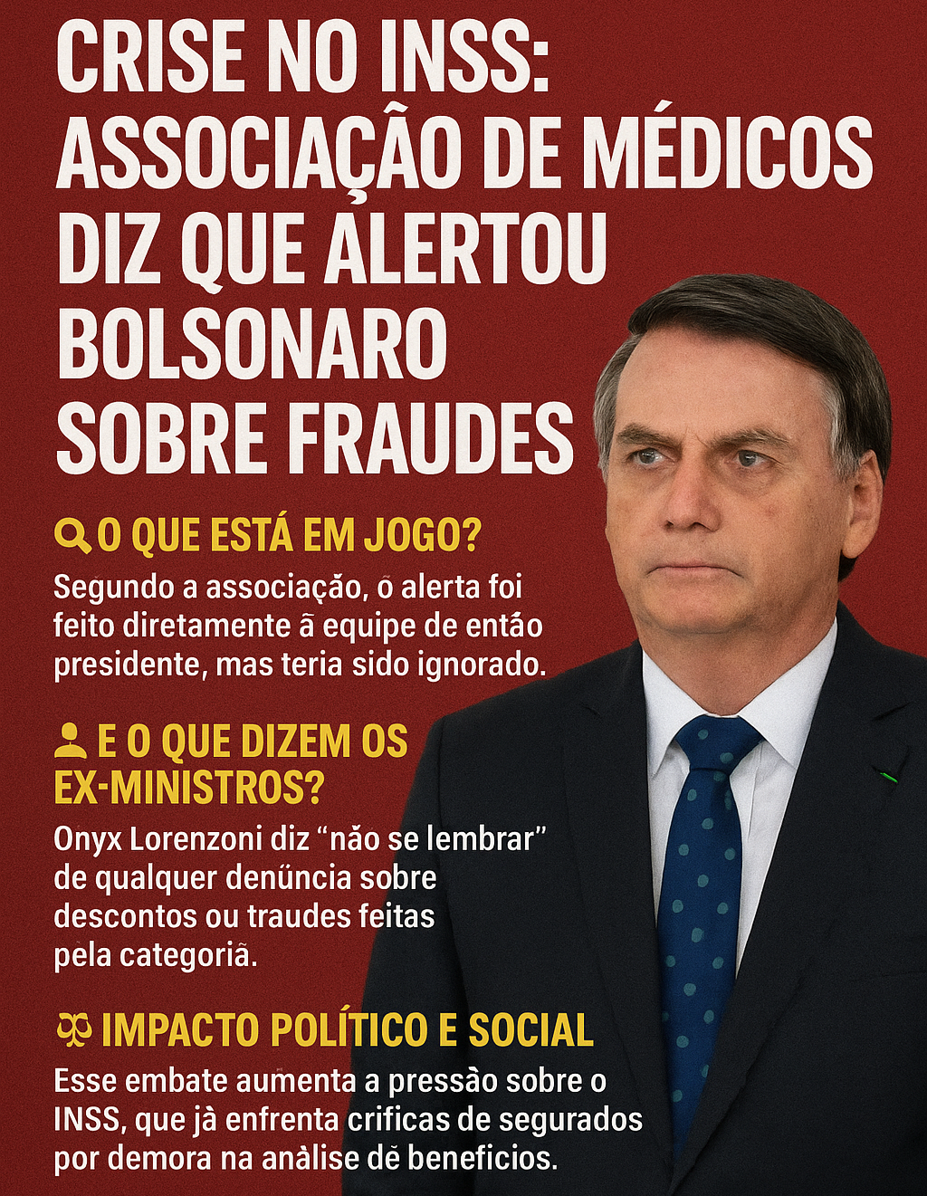 A novela envolvendo o INSS (Instituto Nacional do Seguro Social) ganhou mais um capítulo explosivo. A ANMP (Associação Nacional dos Médicos Peritos da Previdência Social) declarou ter informado o ex-presidente Jair Bolsonaro (PL) sobre possíveis fraudes, desvios e irregularidades com dinheiro público ainda na fase de montagem do governo. O que está em jogo? Segundo […]